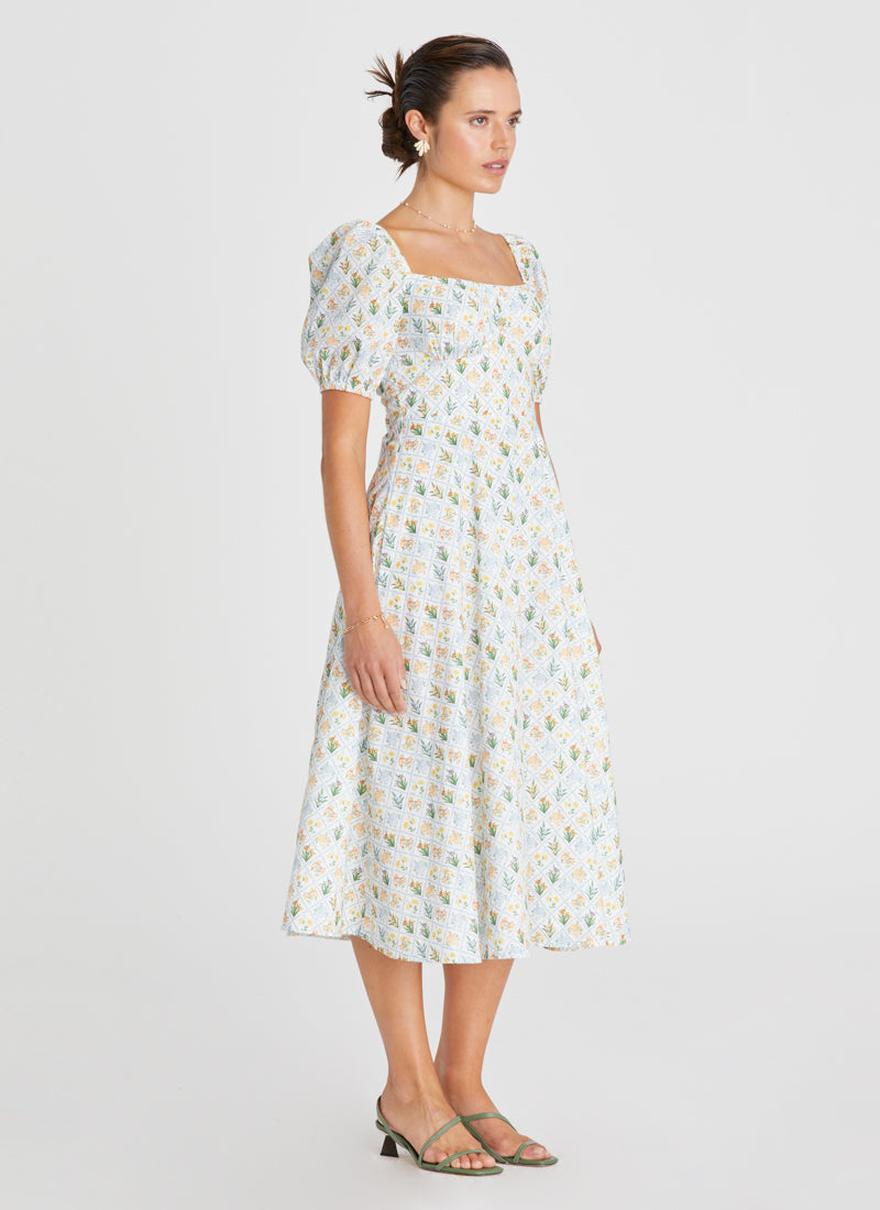 The Casablanca Gigi Midi Dress by Heaven Australia features a flattering ruched bust and a flared skirt that flows effortlessly. The elasticated sleeves can be worn multiple ways for versatile styling options making this must-have wardrobe addition perfect for any occasion.