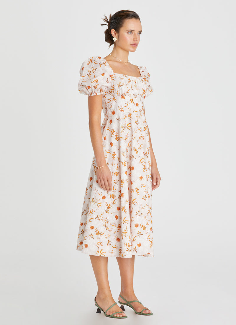 The Mayflower Gigi Midi Dress by Heaven Australia features a flattering ruched bust and a flared skirt that flows effortlessly. The elasticated sleeves can be worn multiple ways for versatile styling options making this must-have wardrobe addition perfect for any occasion.
