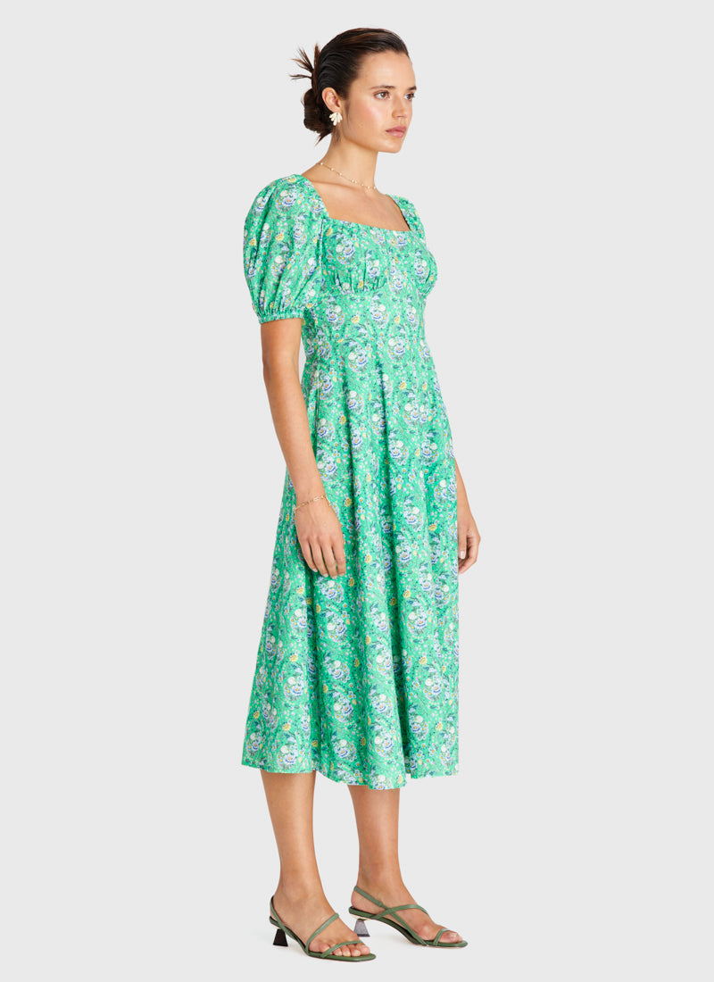 The Prairie Gigi Midi Dress by Heaven Australia features a flattering ruched bust and a flared skirt that flows effortlessly. The elasticated sleeves can be worn multiple ways for versatile styling options making this must-have wardrobe addition perfect for any occasion.