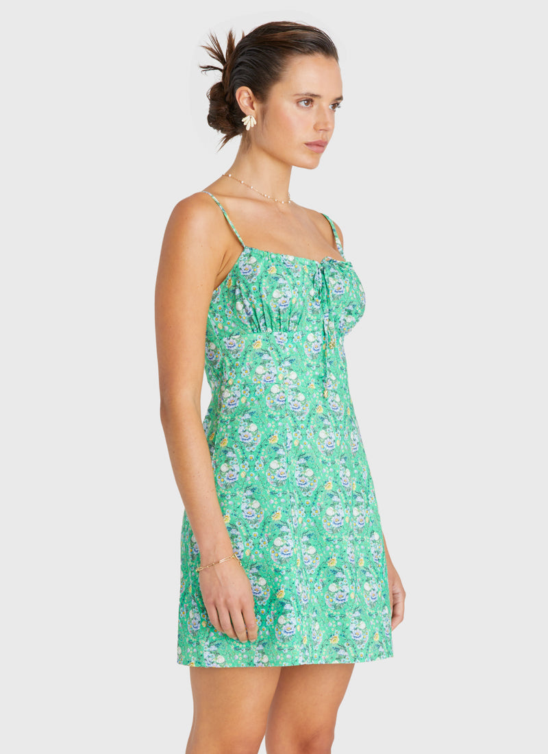 The Prairie Heidi Mini Dress by Heaven Australia is a stunning piece that is perfect for any occasion. It features a front tie-up detail that allows for a custom fit. The ruched bust panel adds a touch of femininity to the dress, while the corset-style fitted waist panel accentuates in all the right places.