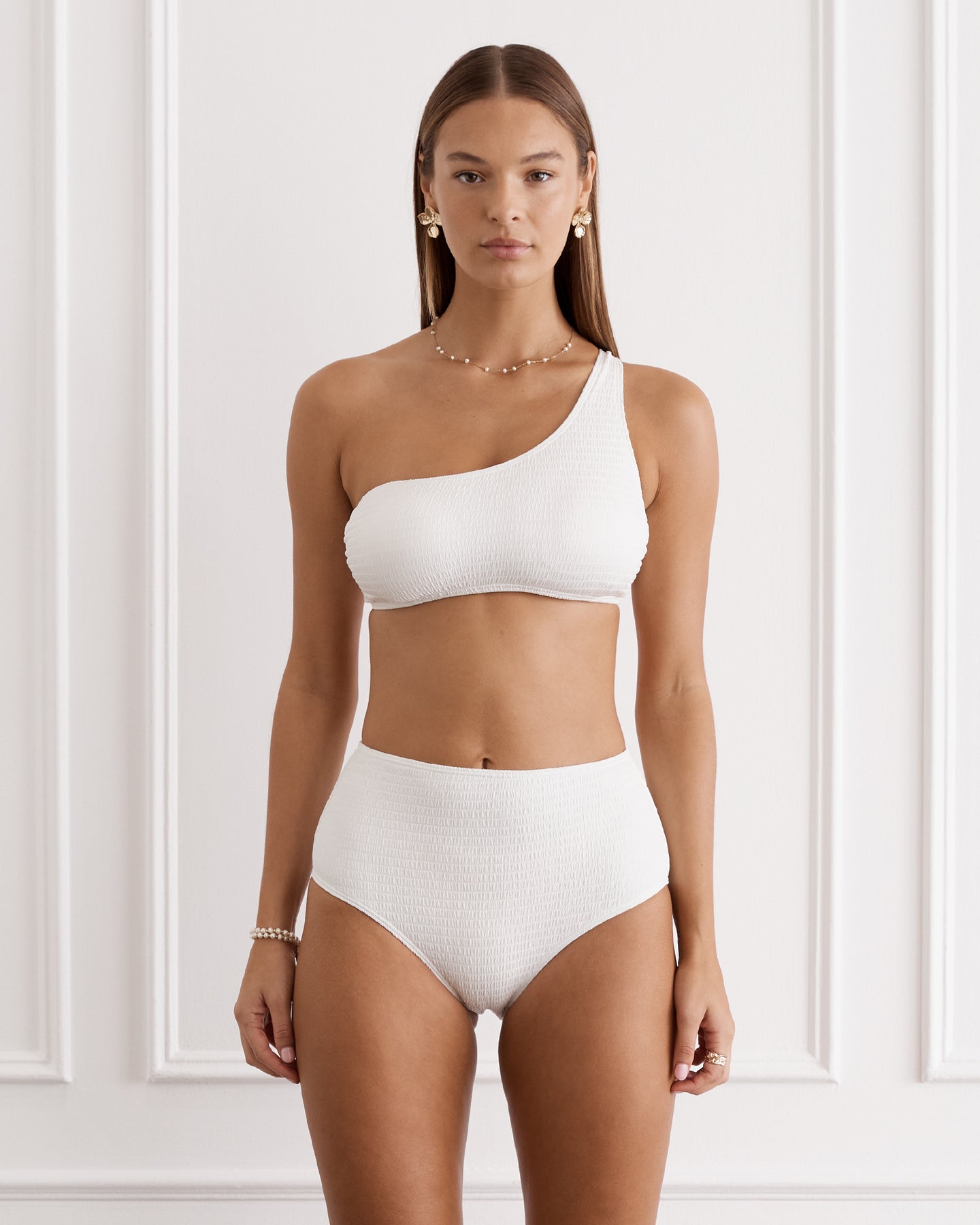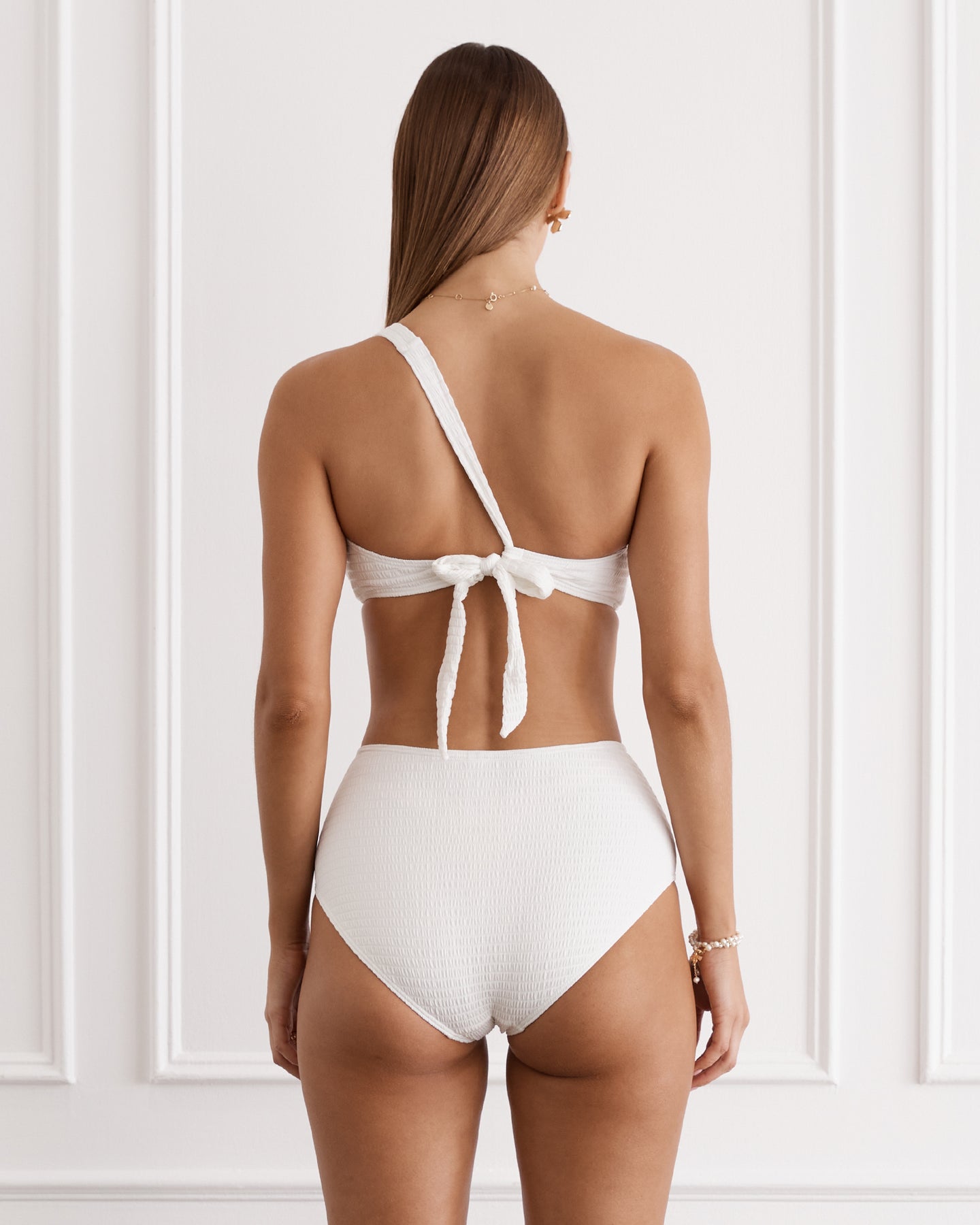 A sculptural standout from our Bianca collection, the Brooke One Shoulder Top exudes effortless elegance. An asymmetric silhouette with removable soft cups and a self-tying back strap for a tailored fit. A sleek design that captures the effortless modernity of summer outfitting.