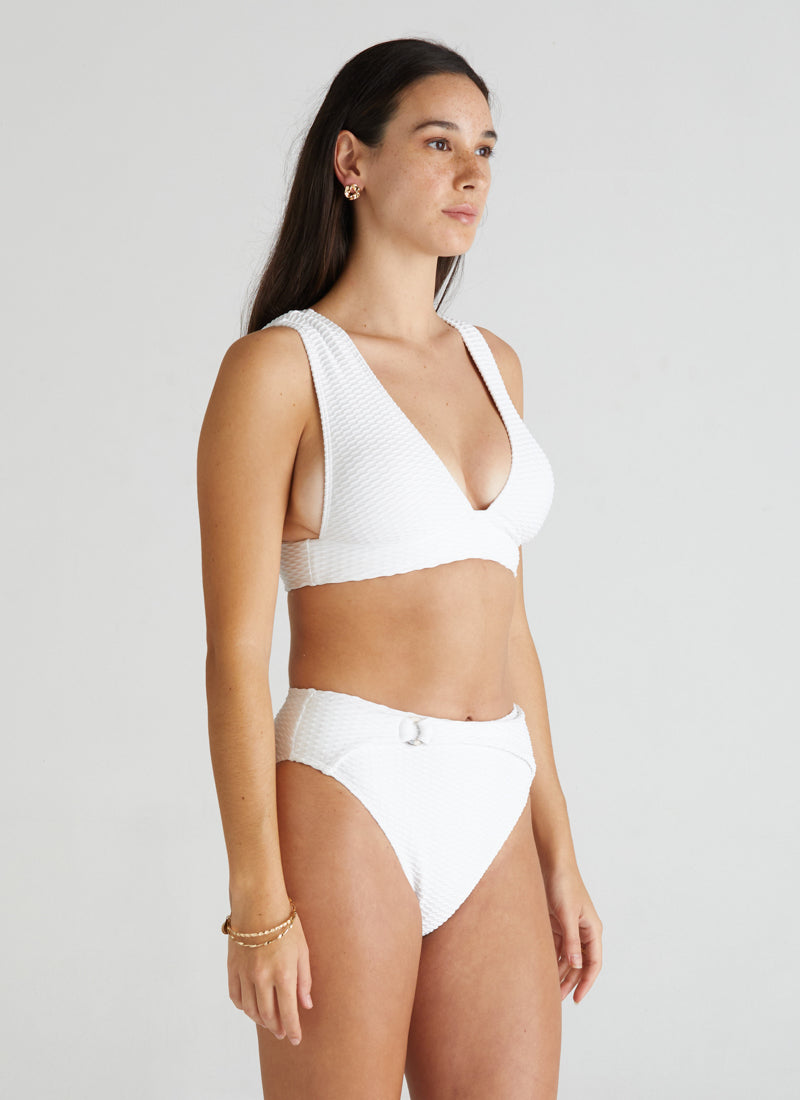 Made from recycled textured jacquard fabric, the Selena Top is the ultimate bikini top featuring comfortable over the shoulder straps, V-plunge neckline and an open square back design.