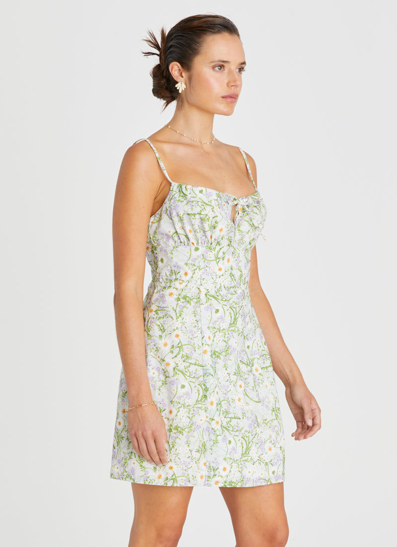 The Thistle Heidi Mini Dress by Heaven Australia is a stunning piece that is perfect for any occasion. It features a front tie-up detail that allows for a custom fit. The ruched bust panel adds a touch of femininity to the dress, while the corset-style fitted waist panel accentuates in all the right places.