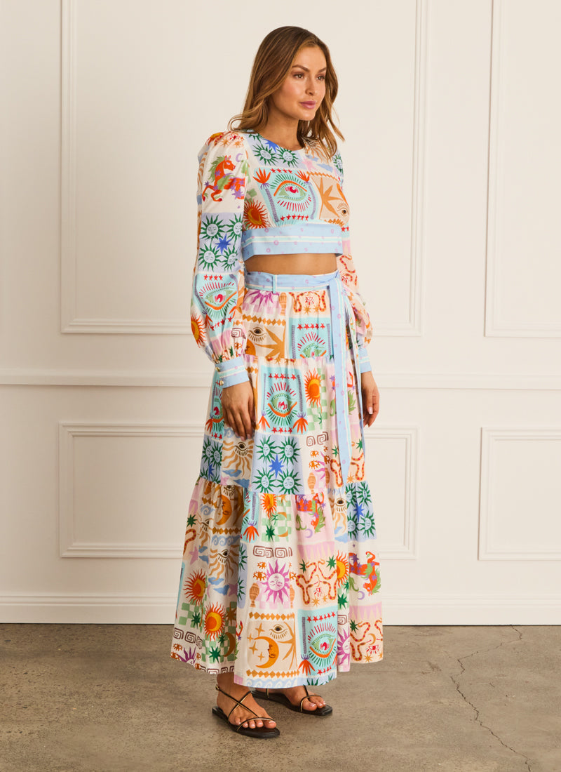 The Zodiac Tia Maxi Skirt by Heaven Australia is crafted from 100% French cotton poplin and is a must-have wardrobe staple. This high waisted maxi skirt features functional side pockets and an invisible side zipper.