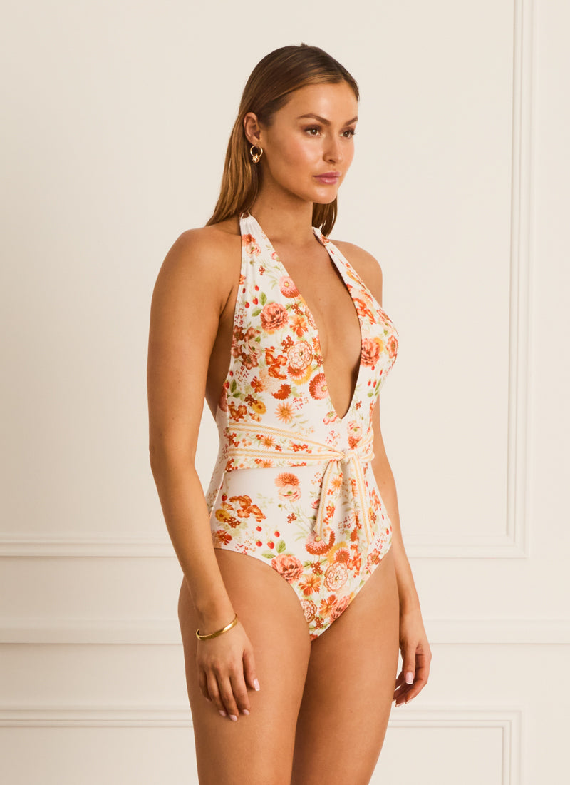 Featuring a flattering halter neck and a striking deep V-neckline, the Carnation Cecilia One Piece is a chic swim wardrobe addition. With removable cups and a faux waist tie belt this Heaven Australia piece offers both style and versatility.